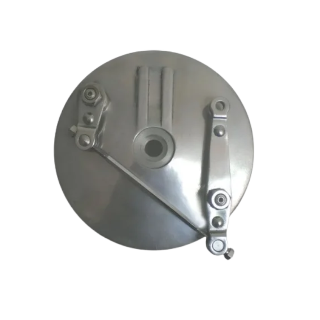 Hero Xtreme Old Model Front Drum Plate is a key part of the front drum braking system. Hero Xtreme Old Model Front Drum Plate is made of durable metal like cast aluminum or steel. Hero Xtreme Old Model Front Drum Plate holds the brake shoes, cam, and other brake components in place. Hero Xtreme Old Model Front Drum Plate ensures proper alignment and operation of braking parts and lies in effective braking and overall rider safety.